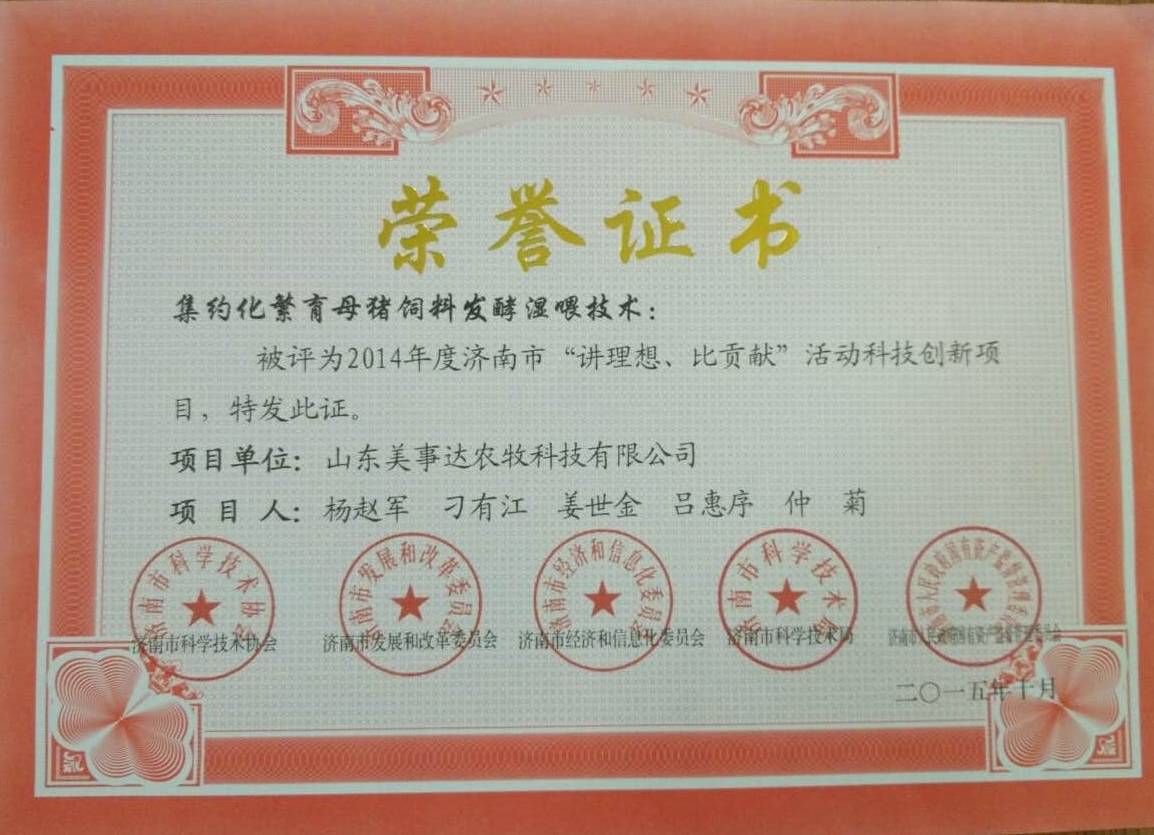 ?我公司于2014年研發推廣的“集約化繁殖母豬飼料發酵濕喂技術”喜獲成功,并在由濟南市科學技術協會、濟南市發展和改革委員會、濟南市經濟和信息化委員會、濟南市科學技術局、濟南市人民政府國有資產監督管理委員會聯合組織的濟南市“講理想、比貢獻”活動中被評為科技創新項目,這是我公司第三次獲此殊榮。圖片為榮譽證書。