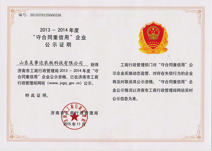 ??? 經(jīng)過(guò)一系列資格評(píng)審,我公司獲得了濟(jì)南市工商行政管理局2013-2014年度“守合同重信用”企業(yè)公示資格,并已在濟(jì)南市工商行政管理局網(wǎng)站公示。此前我公司已連續(xù)多年被認(rèn)定為濟(jì)南市和山東省“守合同重信用”企業(yè)。圖片為濟(jì)南市工商行政管理局為我公司頒發(fā)的公示證明。
