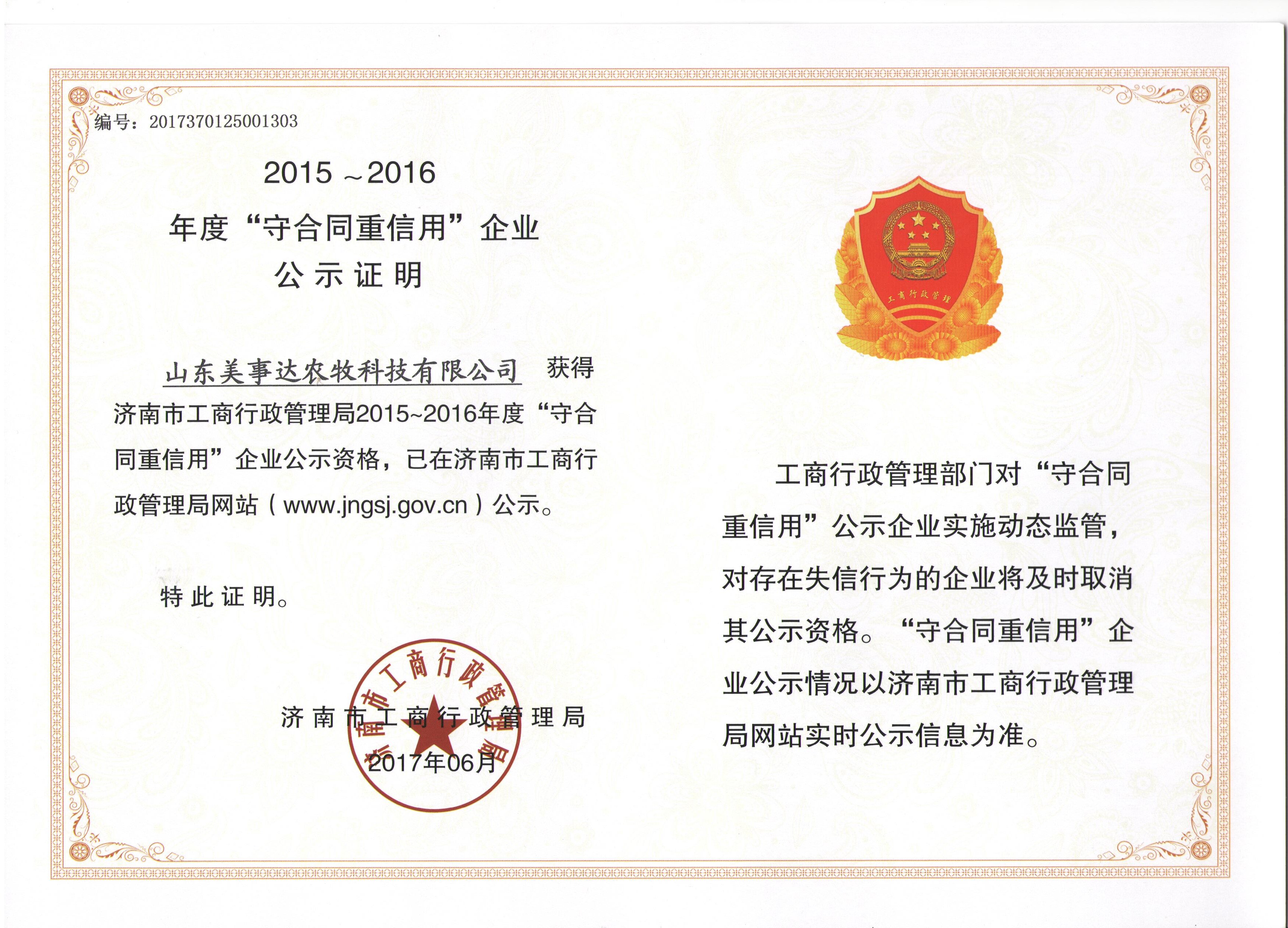 熱烈祝賀我公司獲評濟南市2015-2016年度“守合同重信用企業”,至目前為止我公司已連續多年被評選為濟南市、山東省“守合同重信用企業”,圖片為濟南市工商行政管理局為我公司頒發公示證書。
