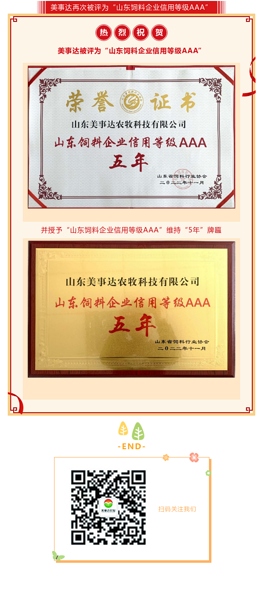 美事達再次被評為“山東飼料企業信用等級AAA”