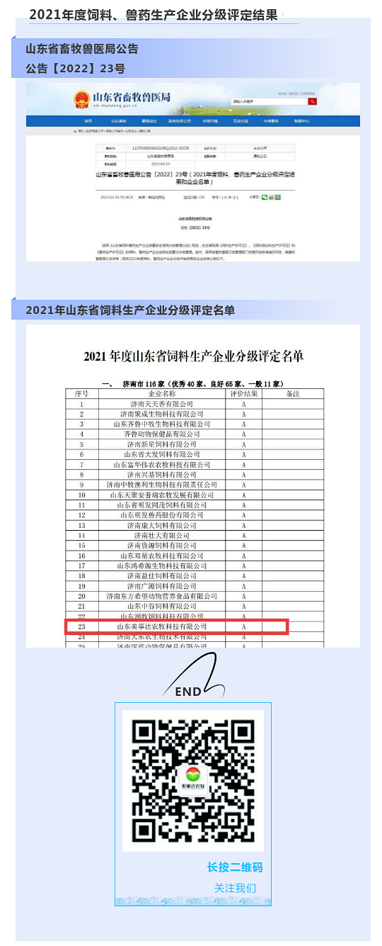 山東省飼料、獸藥生產企業分級評定——美事達再次上榜A級生產企業