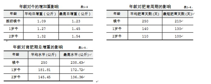 (4)年齡對肥育周期的影響:犢牛的肥育時間比1歲牛或2歲牛長。犢牛肥育時間長的原因是開始肥 育時體重小和日增重低(見表1—4)。