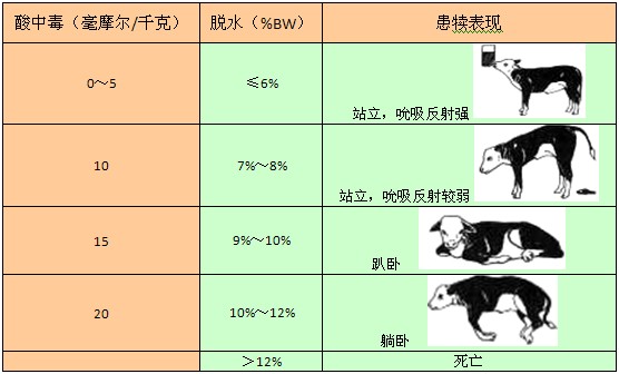 患犢的脫水程度可根據其精神狀態、眼窩下陷程度和皮膚彈性試驗來判斷,同時也可通過患犢臨床表現判斷其體內酸堿平衡狀況,判斷方法參見表1和表2。根據脫水程度和酸堿平衡狀況,可選擇適當的補液方式。通常情況下,脫水8%以下的患犢可通過口服方式補液(ORT);脫水超過8%時,需結合靜脈輸液(IV)和口服補液的方式糾正脫水狀況和酸堿平衡。